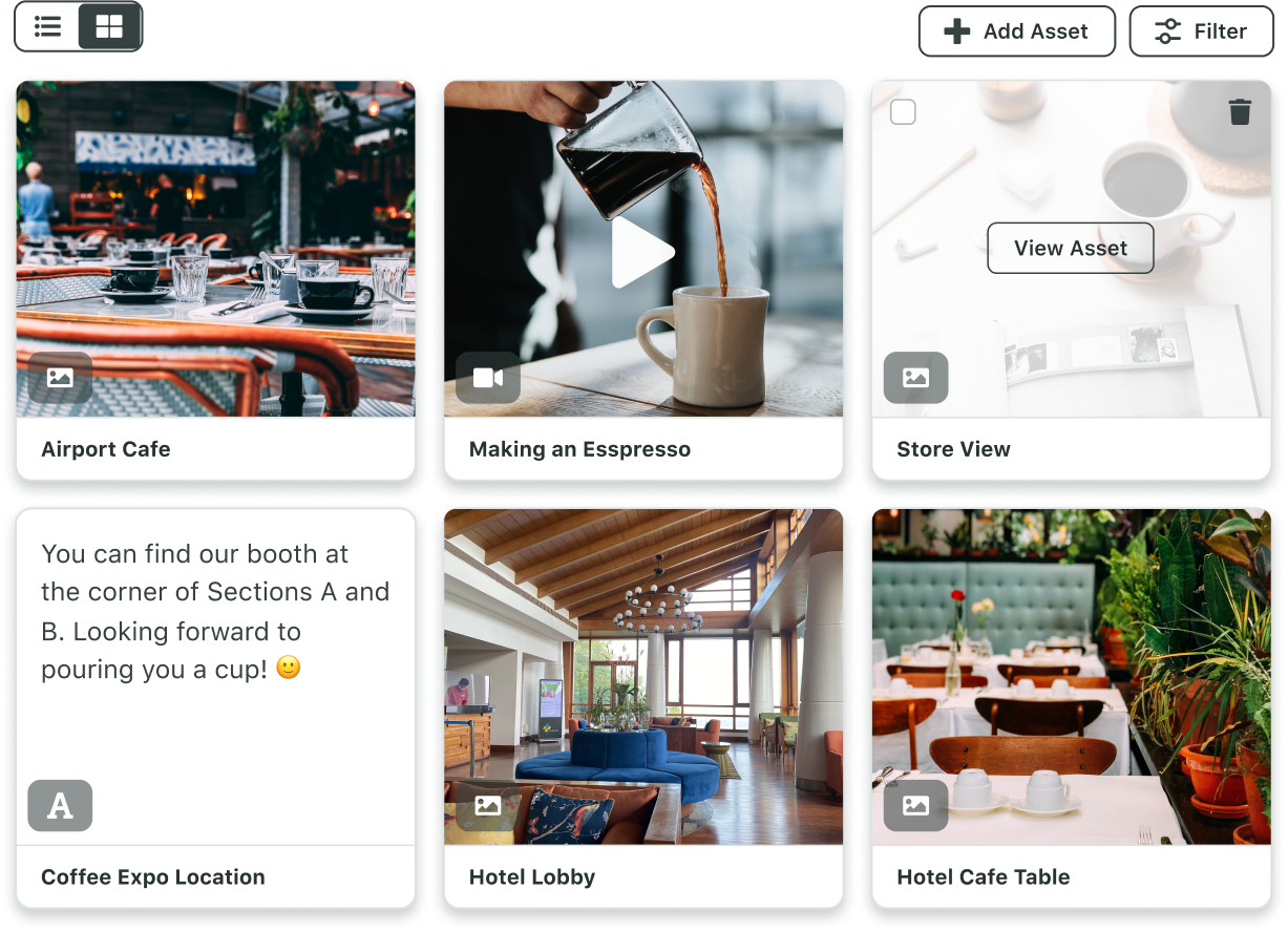 Publish with ease across teams using pre-approved photos, videos and messaging pulled from a centralized Asset Library.