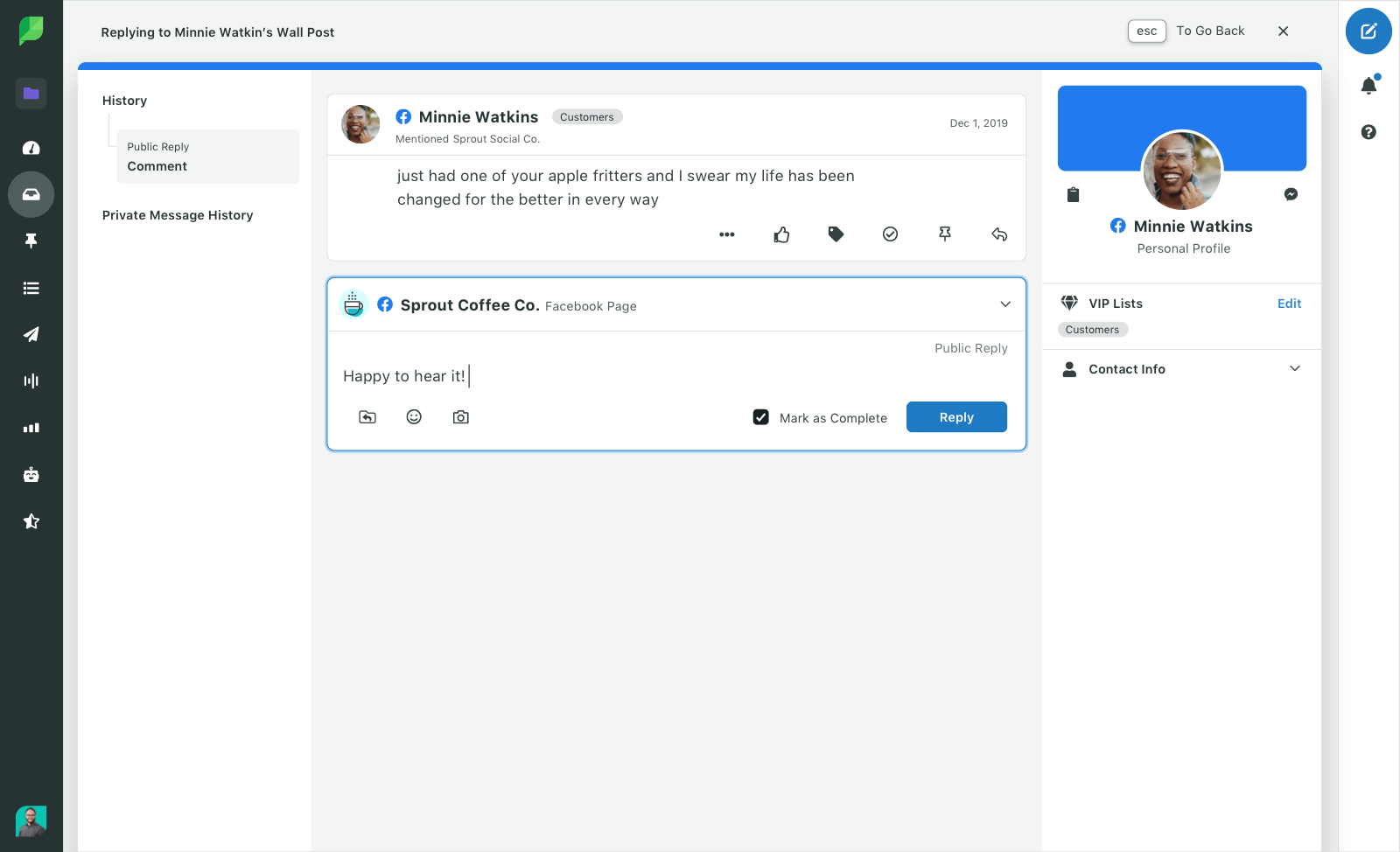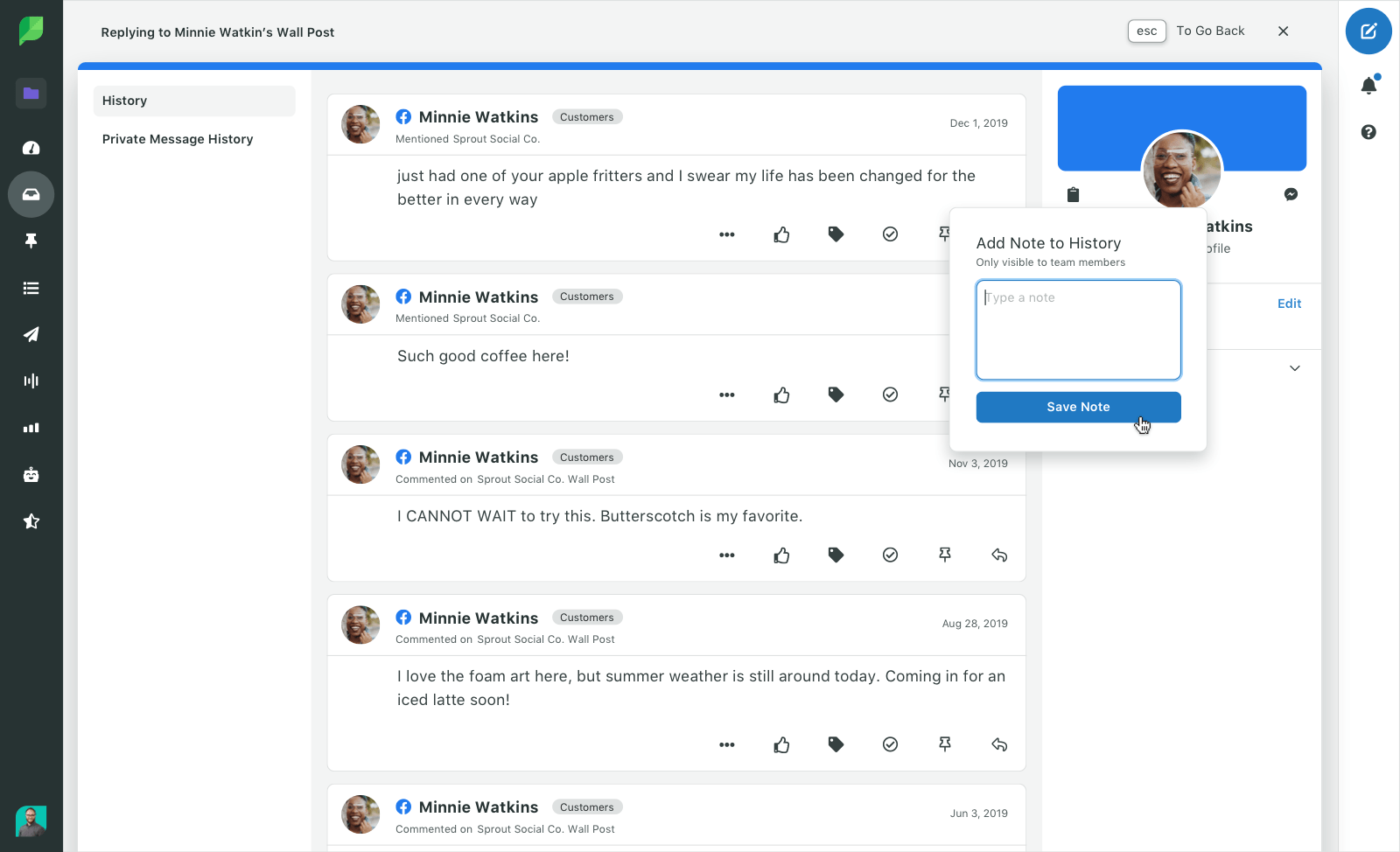 Readily access conversation history, customer records and team tools—like notes—in a unified social CRM contact view.