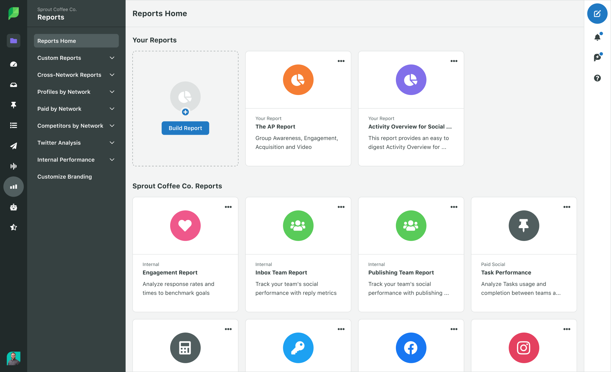In our Analytics Reports home, Sprout users can access social media performance across channels, from a network-level perspective all the way down to individual post performance. The intuitive interface makes it easy to navigate to the key performance indicators (KPIs) and metrics that matter most to your business.