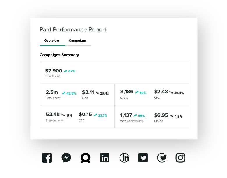 Dive deep into paid social data with powerful performance reporting and deep analytics together. Access hundreds of detailed paid metrics across networks—from spend, clicks and CPM to low-level conversion outcomes like “added to cart,” email registrations and content downloads—and tap into dynamic data visualizations.